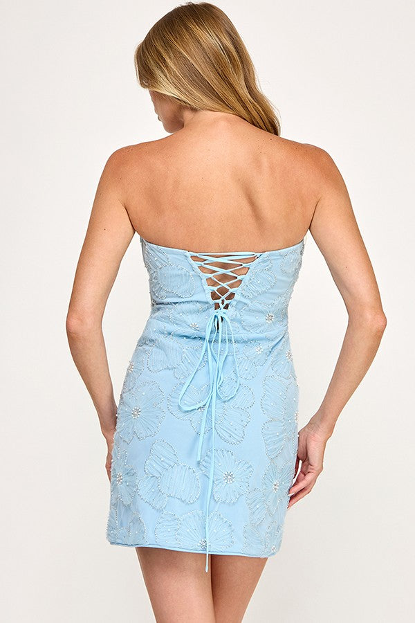 Embrace elegance and youth with The Love List Dress, a strapless mini that perfectly contours your silhouette. Its structured straight-across neckline offers support while showcasing delicate floral beadwork and faux pearls for a refined touch. The body-hugging fit ends at mid-thigh, creating a flirty, true mini length. Adjustable back straps ensure a customized, comfortable fit, making this dress a stunning choice for any special occasion where confidence and style go hand in hand.
