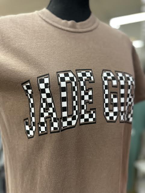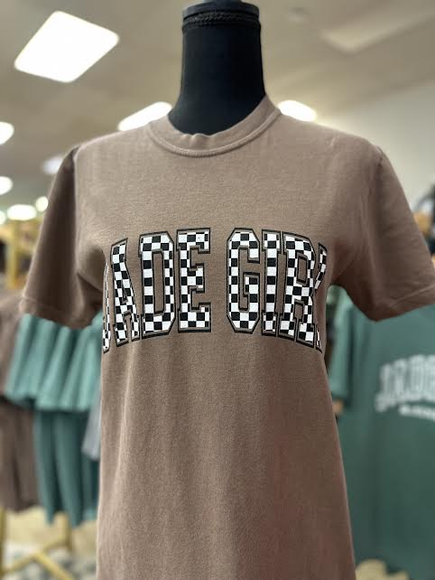 Elevate your casual look with the Checker Jade Girl Tee in rich espresso. This comfortable, stylish tee features a unique checker pattern that adds subtle edge to your everyday wardrobe. Perfect for pairing with jeans or layering under a jacket, its versatile design keeps you effortlessly chic from day to night. Embrace a blend of comfort and trendy appeal with this must-have tee.
